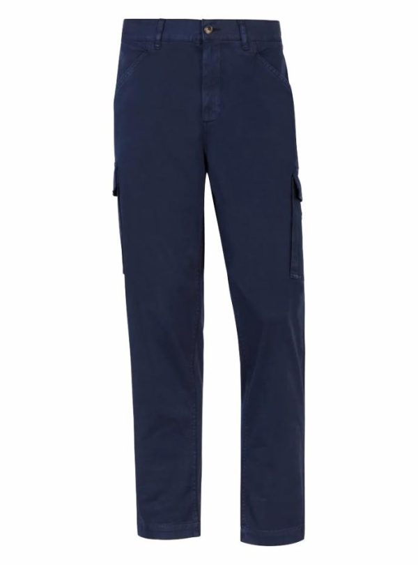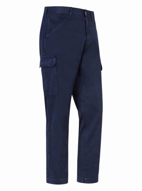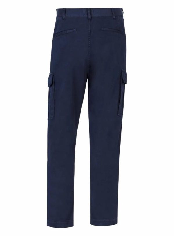 - Zwei seitliche Taschen, zwei schräg aufgesetzte Paspeltaschen hinten, zwei große Pattentaschen seitlich am Hosenbein, Knopf aus echter Steinnuss