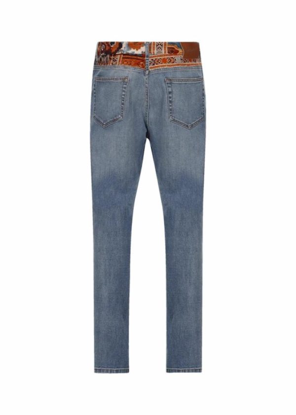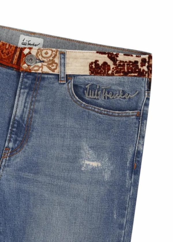 Taschen: Je zwei Vorder- und Gesäßtaschen sowie eine kleine Tasche, eingenäht in der rechten Vordertasche - Besonderheiten: Bund aus Samt mit exklusiv für Luis Trenker designtem Patchwork-Print, gesticktes Luis Trenker Logo oberhalb der linken Tasche