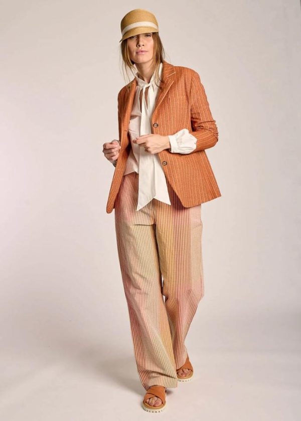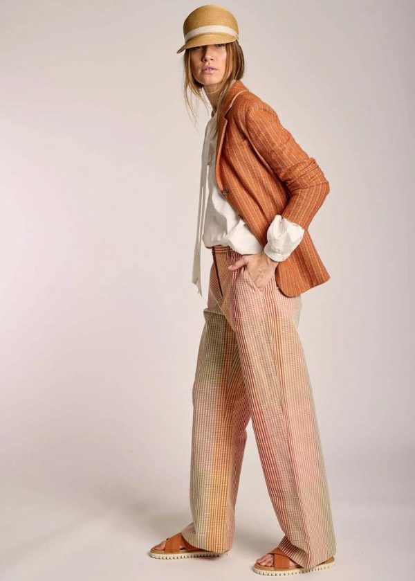 Besonderheiten: Luxuriöser Stoff mit Schimmer-Effekt, lebhaftes Muster aus mehrfarbigen Mini-Karos, die eine dreidimensionale Optik erzeugen, Logoplakette links am Bund - Unser Model Kotryna ist 1,78 m groß und trägt die italienische Größe 42.