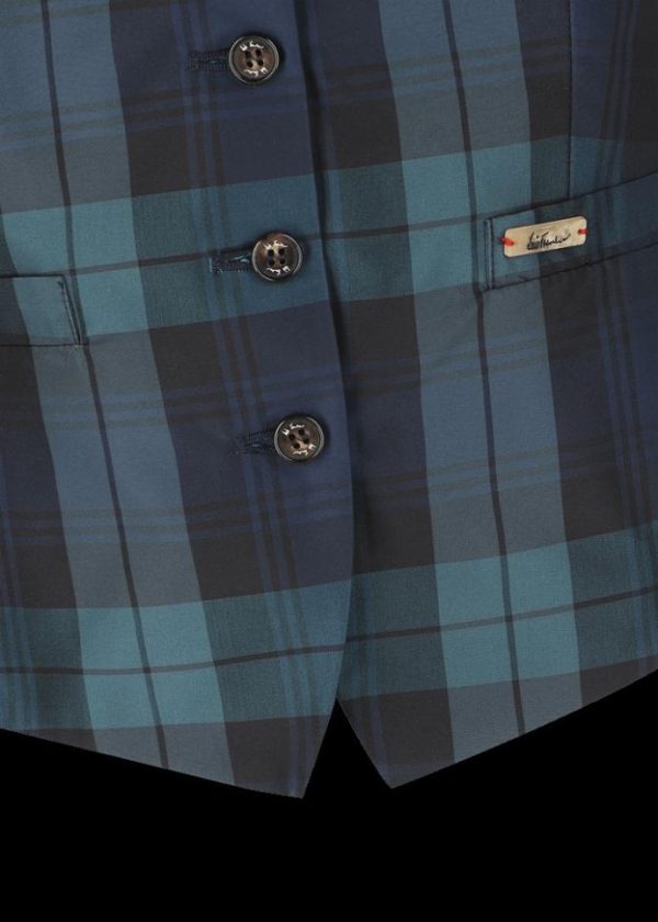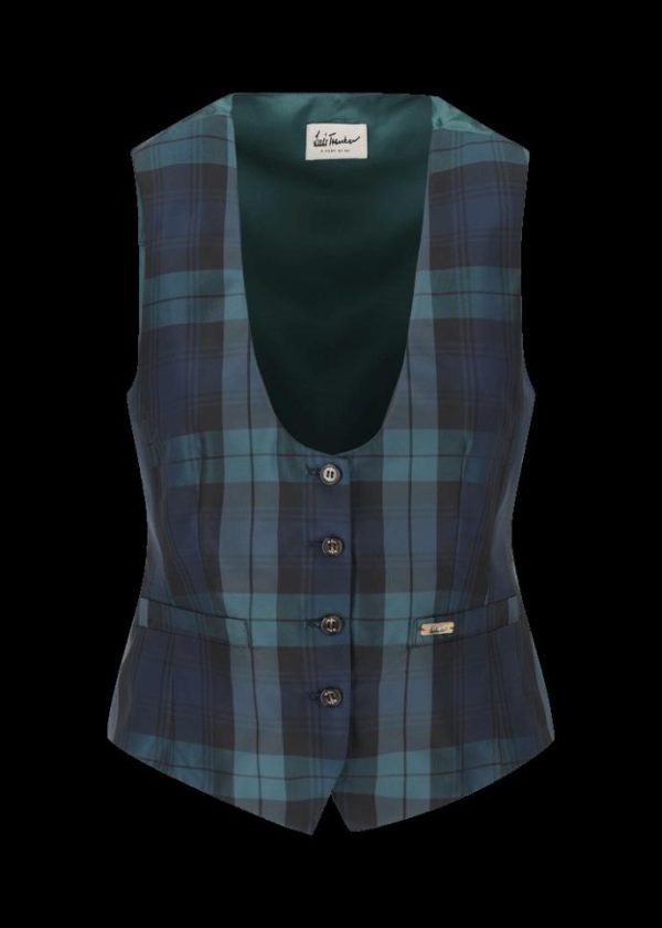 - Diese figurbetonte Weste im Slim Fit mit tiefem U-Ausschnitt, Viskose-Rücken und vier Knöpfen besteht aus reinem Polyester, verarbeitet zu Taft mit Blackwatch Karomuster. Dieser Stoff zeichnet sich durch seine charakteristische starre Struktur sowie sein leichtes Rascheln bei Bewegung aus und wird aufgrund seines luxuriösen Aussehens oft für großzügig drapierte Ballkleider verwendet. Je nach Lichteinfallswinkel schimmert Taft in einer anderen Farbe, was zu seinem außergewöhnlichen Charme beiträgt. Ein weiterer Vorzug dieser Weste: Der Ausschnitt verlängert Oberkörper, Hals und Gesicht optisch, betont das Decolleté und ist auch für größere Oberweiten geeignet.