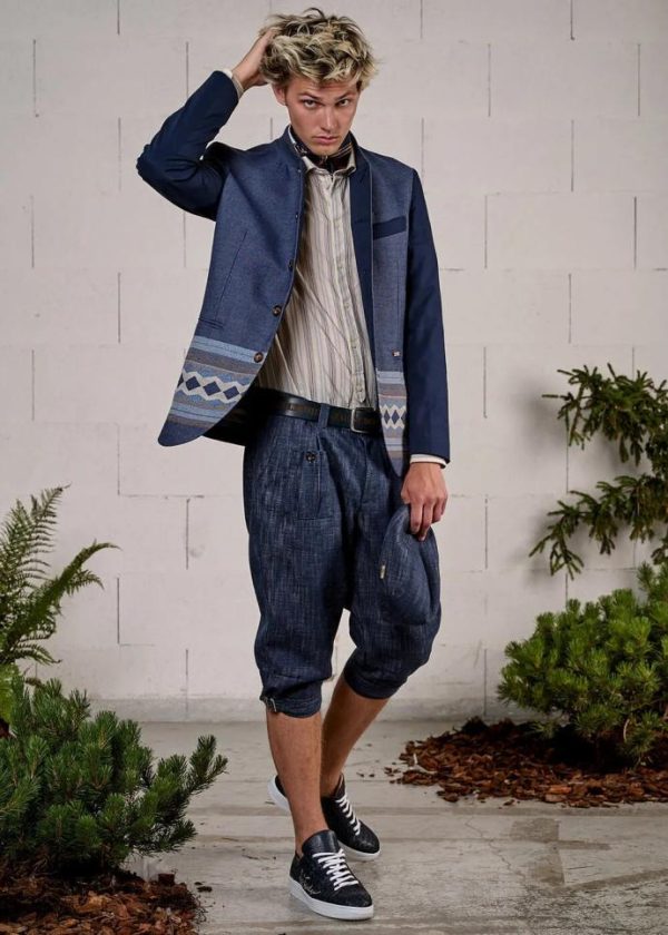 - Eine aufgesetzte Tasche mit Knopfverschluss vorne, zwei Paspeltaschen hinten