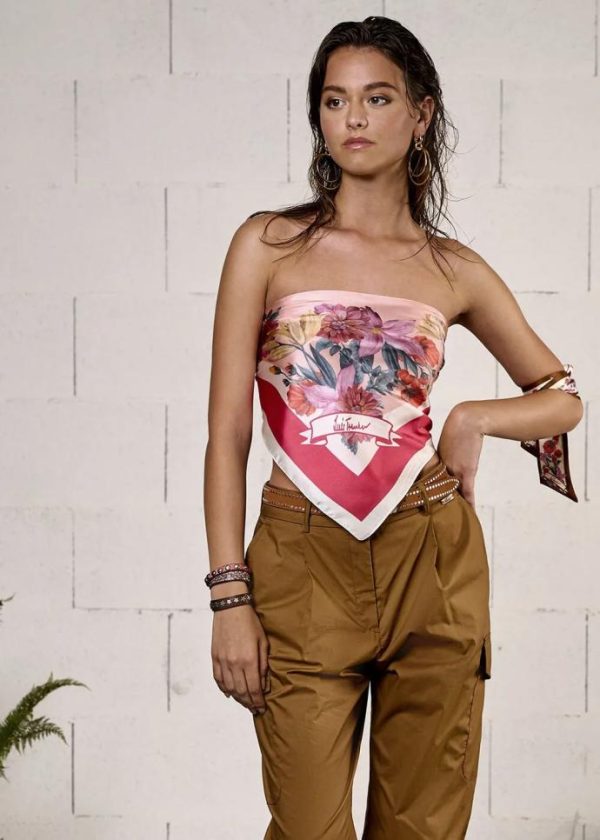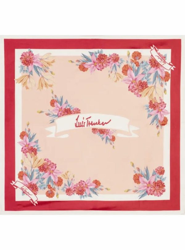 - Tuch mit floralem Muster in Rosa- und Pink-Tönen und zentralem Luis Trenker Logo als Banner