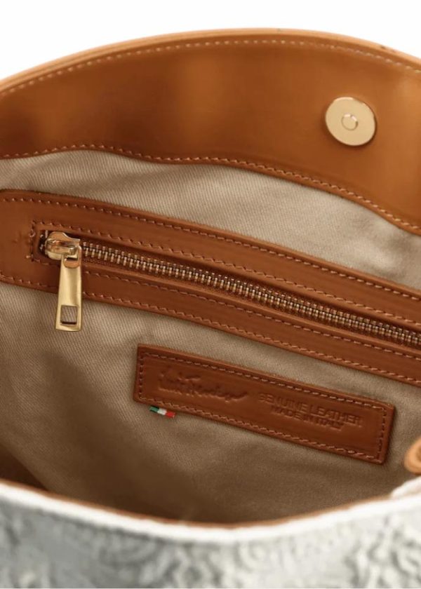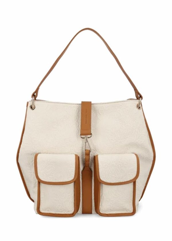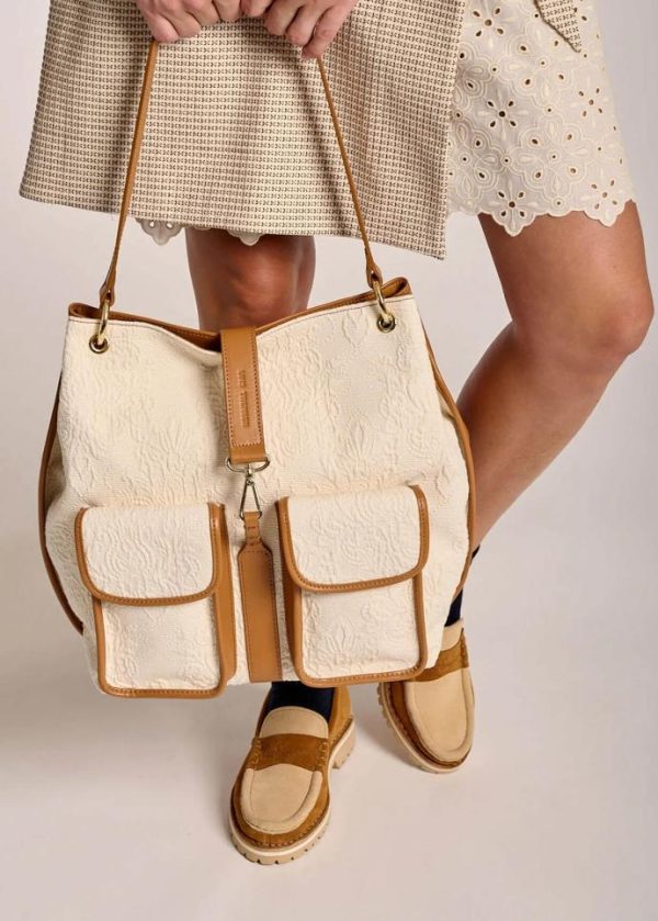 - Diese in Italien gefertigte Handtasche besteht vorne aus einem edlen Baumwolljacquard mit floralem Motiv, während die Rückseite und die Details aus cognacfarbenem Echtleder gefertigt sind. Durch die beiden aufgesetzten Taschen mit Klappe an der Vorderseite, das Innenfach mit Reißverschluss und das geräumige Hauptfach bietet sie Platz für alles, was Du unterwegs brauchst.