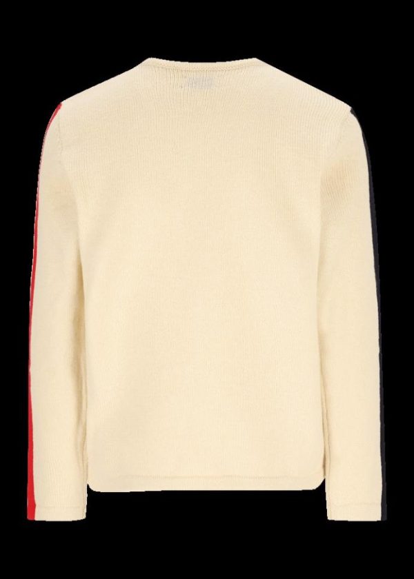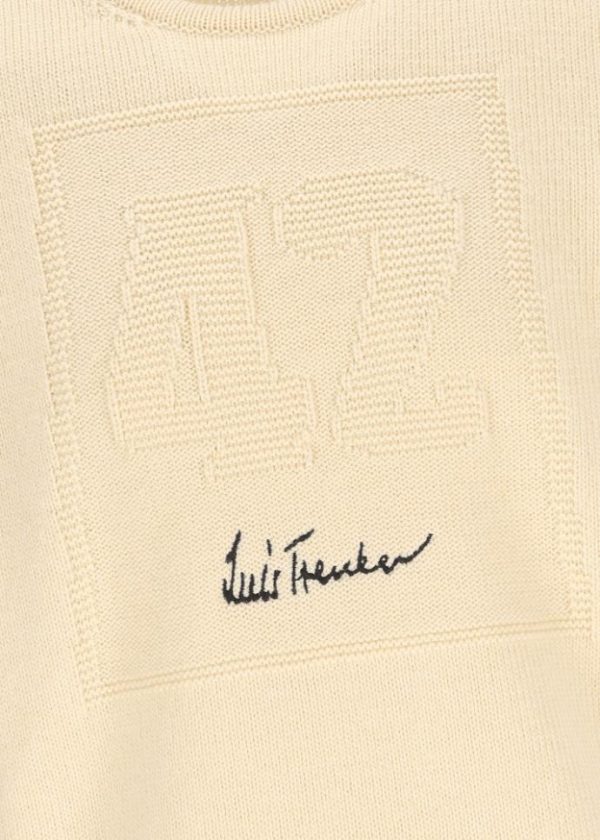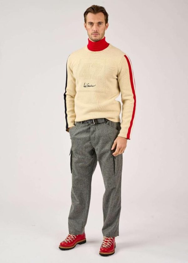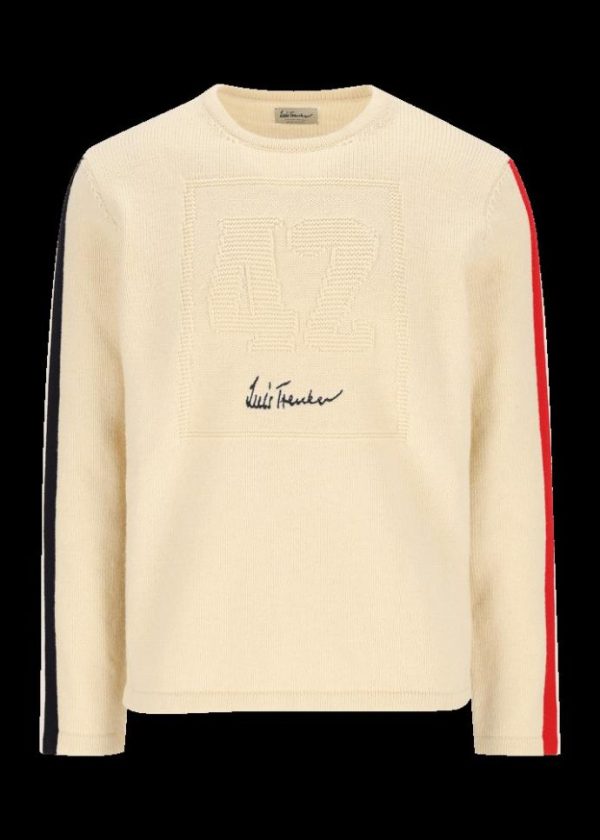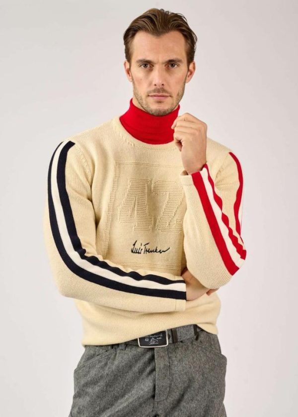 - Dieser Strickpullover im Regular Fit mit Rundhalsausschnitt besteht aus einer angenehmen, glatt gestrickten Merino-Wollmischung. Die Vorderseite wird von der ikonischen Zahl 42 – Luis Trenkers Startnummer bei sämtlichen Skirennen – geziert, die im selben Farbton, aber im traditionellen Links-Links-Strickmuster gehalten ist. Die Streifen in Kontrastfarben entlang der Ärmel unterstreichen den ebenso sportlichen wie nostalgischen Charme dieses Pullovers.