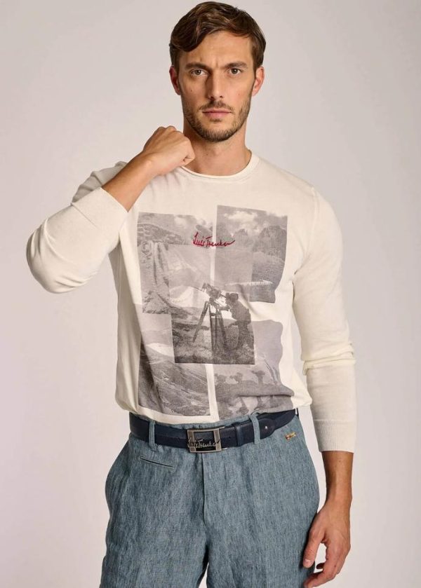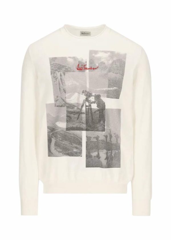 - Dieser Strickpullover im Regular Fit mit leicht aufgerolltem Rundhalsausschnitt besteht aus reiner, glatt gestrickter Baumwolle und präsentiert fünf originale Schwarz-Weiß-Fotografien aus Luis Trenkers Leben als Digitaldruck auf seiner Vorderseite.
