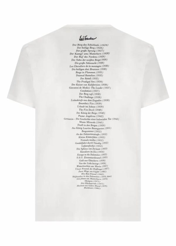 - Dieses T-Shirt im Regular Fit mit kurzen Ärmeln und Rundhalsausschnitt besteht aus reiner Baumwolle und besticht durch ein stilisiertes Luis Trenker Porträt mit dekorativen Elementen als Print auf der Brust. Am Rücken hingegen befindet sich Luis Trenkers Filmografie als All-Over-Print.