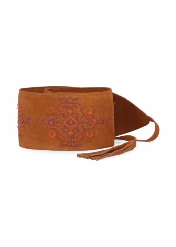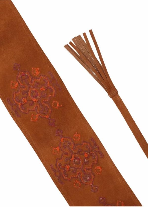 - Dieser breite Gürtel aus hochwertigem Wildleder mit aufwändigen Stickereien im Ethno-Look kann dank der Bänder mit Fransenabschluss lässig um die Taille geknotet werden und betont so die weibliche Silhouette.